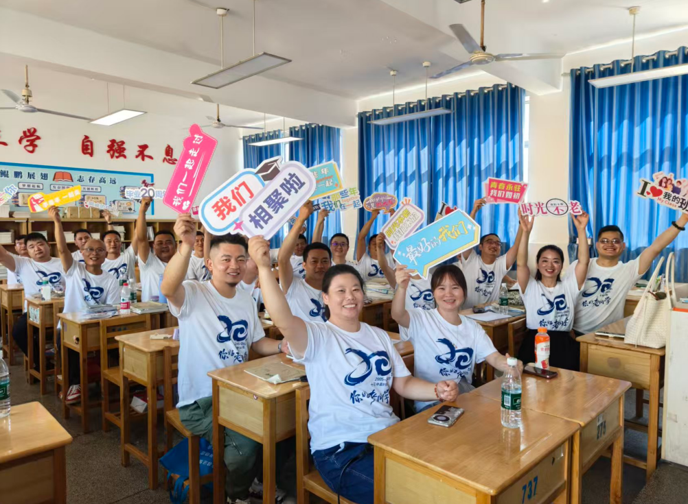 当天上午9点30分,同学们陆续走进焕新的教学楼,重逢的喜悦和激动汹涌而来。拥抱、签到、拍照、领取统一纪念班服,在熟悉的教室里笑谈青春,进行一场时光对话。校长官孟琼、副校长曾锐文(时任91班语文老师)、班主任郭三查、英语老师柳芳出席了本次活动,与同学们欢聚一堂,共忆青春岁月,共话母校发展。