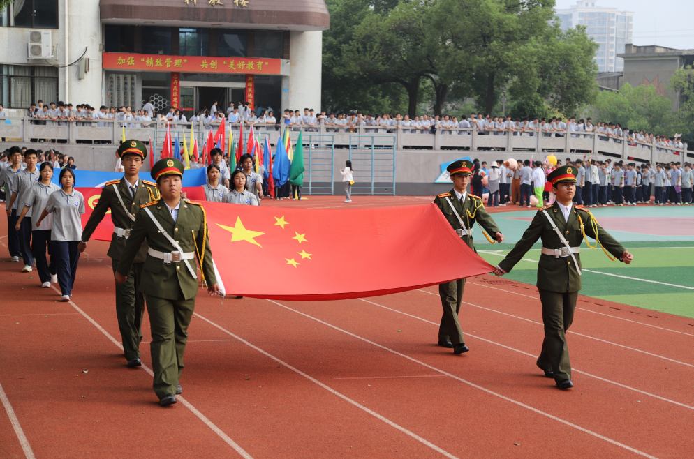 雄赳赳,气昂昂,国旗方阵踏着整齐有劲的步伐首先入场。晨风习习,旗面迎风招展;朝阳温暖,国旗耀眼夺目,它承载着中华儿女的信仰和荣誉。校旗迎风飘扬,它象征了我校体育工作蓬勃生机。各方阵队迈着矫健的步伐,洋溢着青春的朝气,正昂首阔步的走来!