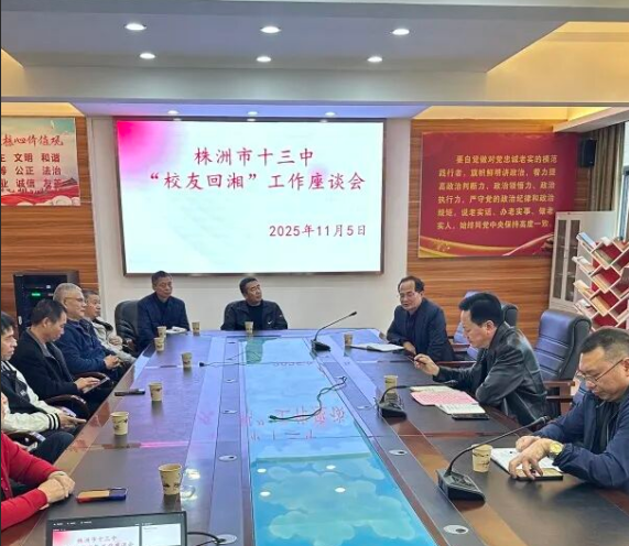 初冬暖阳,再聚石子山头;情系母校,共绘发展蓝图。11月5日下午,株洲市十三中“校友回湘”工作座谈会在学校科教楼二楼会议室召开。会议由对外交流处主任李爱明主持,学校党委书记孟祥忠、副校长文新岳出席会议并讲话。部分班主任与退休教师代表彭映梅等十余位老师围坐一堂,围绕“校友回湘”工作深入交流,共谋学校未来。