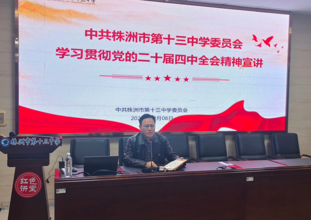 为深入学习贯彻党的二十届四中全会精神,引领学校教育高质量发展,12月8日下午,株洲市第十三中学邀请市委党校管理学教研部主任、副教授徐卫华来校进行专题宣讲。讲座由校党委委员、副校长梅光幸主持,学校领导班子及全体教职工参加学习。